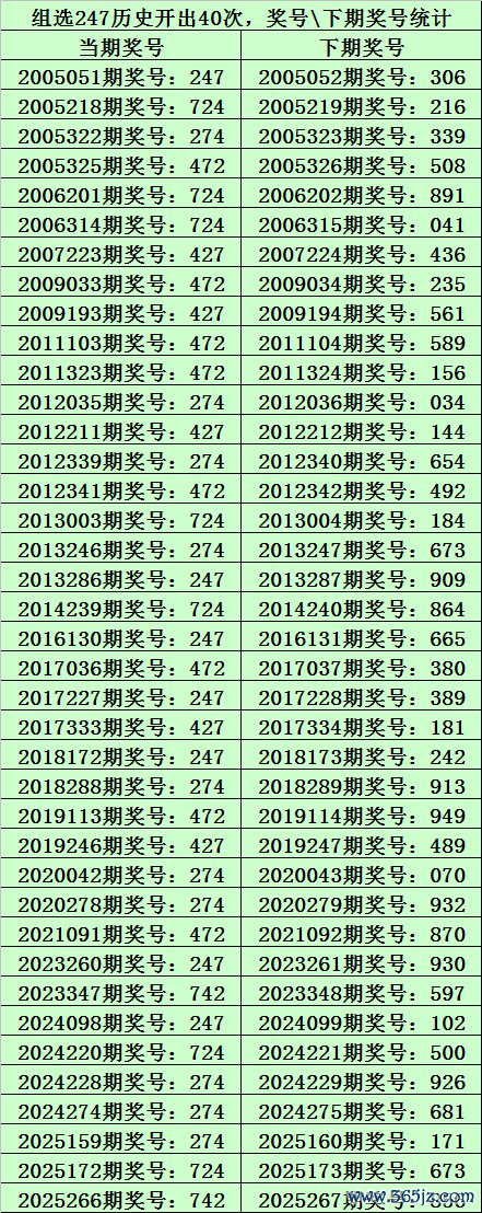 二、组选247分析:胪列三历史上已开出40次组选号码247了,其奖号和下期开出奖号统计如下: